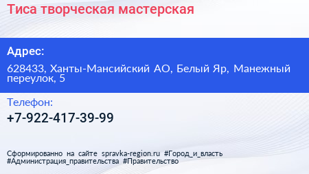 Тиса, творческая мастерская по адресу 628433, Ханты-Мансийский АО, Белый Яр, Манежный переулок, 5 в дальнейшем Организация, размещена в следующих категориях: