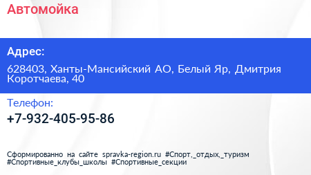 Автомойка по адресу 628403, Ханты-Мансийский АО, Белый Яр, Дмитрия Коротчаева, 40 в дальнейшем Организация, размещена в следующих категориях: