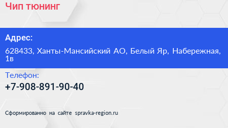 Чип-тюнинг по адресу 628433, Ханты-Мансийский АО, Белый Яр, Набережная, 1в в дальнейшем Организация, размещена в следующих категориях: