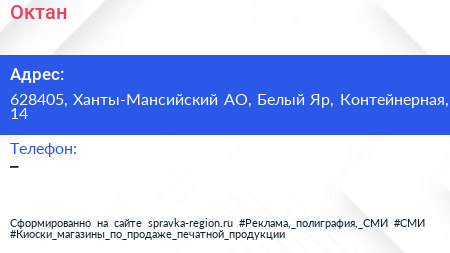 Октан по адресу 628405, Ханты-Мансийский АО, Белый Яр, Контейнерная, 14 в дальнейшем Организация, размещена в следующих категориях: