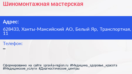 Шиномонтажная мастерская по адресу 628433, Ханты-Мансийский АО, Белый Яр, Транспортная, 11 в дальнейшем Организация, размещена в следующих категориях: