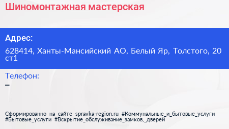 Шиномонтажная мастерская по адресу 628414, Ханты-Мансийский АО, Белый Яр, Толстого, 20 ст1 в дальнейшем Организация, размещена в следующих категориях: