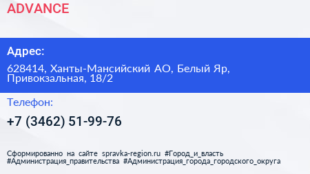 ADVANCE по адресу 628414, Ханты-Мансийский АО, Белый Яр, Привокзальная, 18/2 в дальнейшем Организация, размещена в следующих категориях: