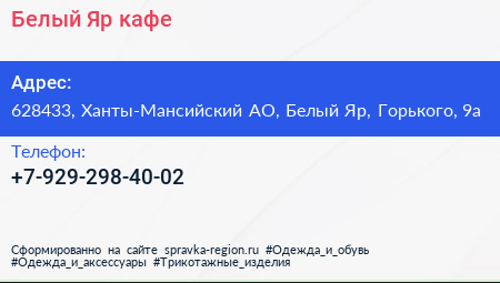Белый Яр, кафе по адресу 628433, Ханты-Мансийский АО, Белый Яр, Горького, 9а в дальнейшем Организация, размещена в следующих категориях: