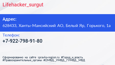 Lifehacker_surgut по адресу 628433, Ханты-Мансийский АО, Белый Яр, Горького, 1а в дальнейшем Организация, размещена в следующих категориях: