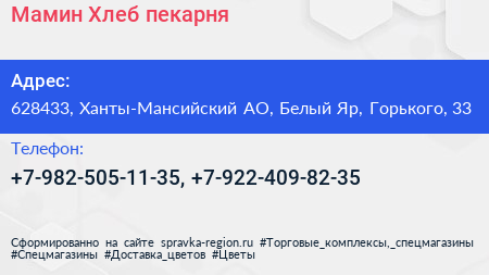Мамин Хлеб, пекарня по адресу 628433, Ханты-Мансийский АО, Белый Яр, Горького, 33 в дальнейшем Организация, размещена в следующих категориях: