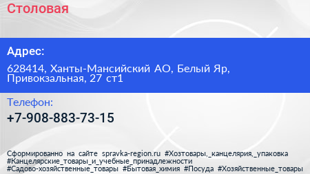 Столовая по адресу 628414, Ханты-Мансийский АО, Белый Яр, Привокзальная, 27 ст1 в дальнейшем Организация, размещена в следующих категориях: