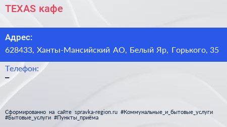 ТEXAS, кафе по адресу 628433, Ханты-Мансийский АО, Белый Яр, Горького, 35 в дальнейшем Организация, размещена в следующих категориях: