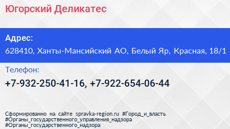 Югорский Деликатес по адресу 628410, Ханты-Мансийский АО, Белый Яр, Красная, 18/1 в дальнейшем Организация, размещена в следующих категориях: