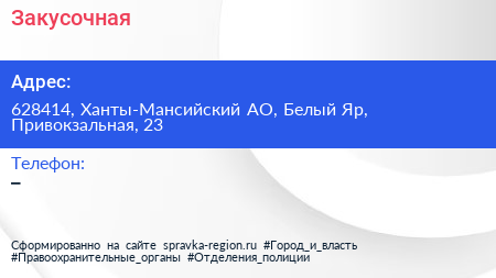 Закусочная по адресу 628414, Ханты-Мансийский АО, Белый Яр, Привокзальная, 23 в дальнейшем Организация, размещена в следующих категориях: