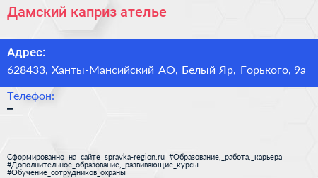 Дамский каприз, ателье по адресу 628433, Ханты-Мансийский АО, Белый Яр, Горького, 9а в дальнейшем Организация, размещена в следующих категориях: