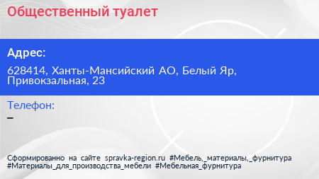Общественный туалет по адресу 628414, Ханты-Мансийский АО, Белый Яр, Привокзальная, 23 в дальнейшем Организация, размещена в следующих категориях: