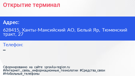Открытие, терминал по адресу 628415, Ханты-Мансийский АО, Белый Яр, Тюменский тракт, 27 в дальнейшем Организация, размещена в следующих категориях: