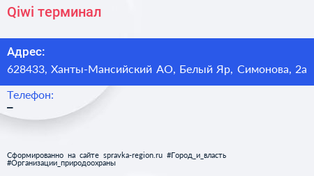 Qiwi, терминал по адресу 628433, Ханты-Мансийский АО, Белый Яр, Симонова, 2а в дальнейшем Организация, размещена в следующих категориях: