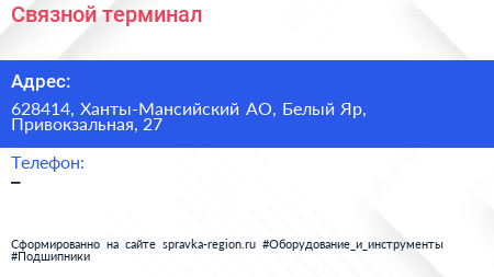 Связной, терминал по адресу 628414, Ханты-Мансийский АО, Белый Яр, Привокзальная, 27 в дальнейшем Организация, размещена в следующих категориях: