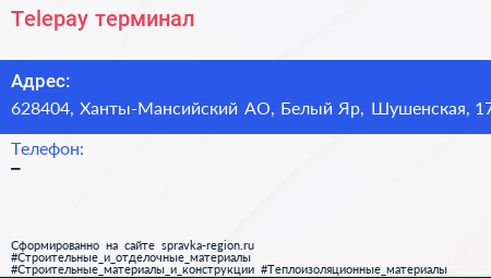 Telepay, терминал по адресу 628404, Ханты-Мансийский АО, Белый Яр, Шушенская, 17 в дальнейшем Организация, размещена в следующих категориях:
