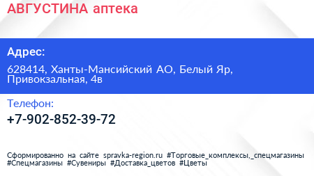 АВГУСТИНА, аптека по адресу 628414, Ханты-Мансийский АО, Белый Яр, Привокзальная, 4в в дальнейшем Организация, размещена в следующих категориях: