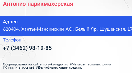Антонио, парикмахерская по адресу 628404, Ханты-Мансийский АО, Белый Яр, Шушенская, 17 в дальнейшем Организация, размещена в следующих категориях: