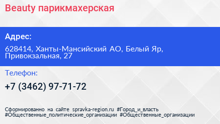 Beauty, парикмахерская по адресу 628414, Ханты-Мансийский АО, Белый Яр, Привокзальная, 27 в дальнейшем Организация, размещена в следующих категориях: