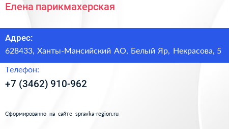 Елена, парикмахерская по адресу 628433, Ханты-Мансийский АО, Белый Яр, Некрасова, 5 в дальнейшем Организация, размещена в следующих категориях: