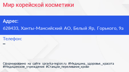 Мир корейской косметики по адресу 628433, Ханты-Мансийский АО, Белый Яр, Горького, 9а в дальнейшем Организация, размещена в следующих категориях: