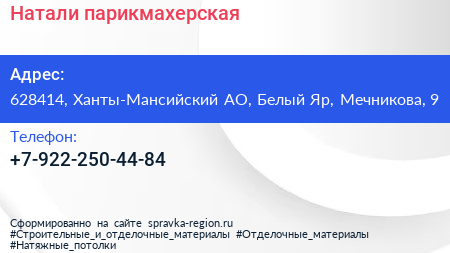 Натали, парикмахерская по адресу 628414, Ханты-Мансийский АО, Белый Яр, Мечникова, 9 в дальнейшем Организация, размещена в следующих категориях: