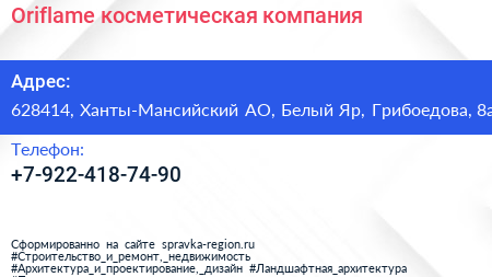 Oriflame, косметическая компания по адресу 628414, Ханты-Мансийский АО, Белый Яр, Грибоедова, 8а в дальнейшем Организация, размещена в следующих категориях: