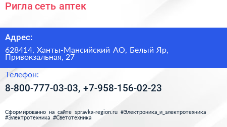 Ригла, сеть аптек по адресу 628414, Ханты-Мансийский АО, Белый Яр, Привокзальная, 27 в дальнейшем Организация, размещена в следующих категориях: