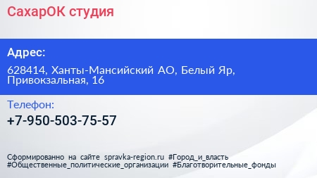 СахарОК, студия по адресу 628414, Ханты-Мансийский АО, Белый Яр, Привокзальная, 16 в дальнейшем Организация, размещена в следующих категориях: