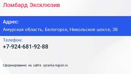 Ломбард Эксклюзив по адресу Амурская область, Белогорск, Никольское шоссе, 38 в дальнейшем Организация, размещена в следующих категориях: