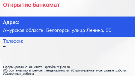 Открытие, банкомат по адресу Амурская область, Белогорск, улица Ленина, 30 в дальнейшем Организация, размещена в следующих категориях: