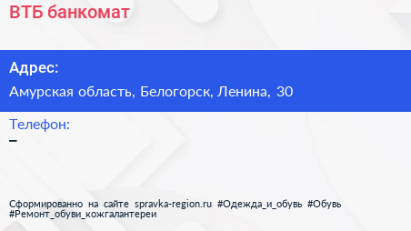 ВТБ, банкомат по адресу Амурская область, Белогорск, Ленина, 30 в дальнейшем Организация, размещена в следующих категориях: