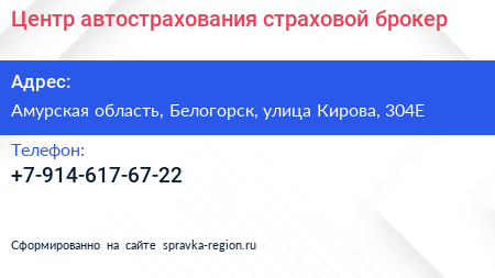 Центр автострахования, страховой брокер по адресу Амурская область, Белогорск, улица Кирова, 304Е в дальнейшем Организация, размещена в следующих категориях: