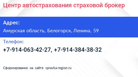 Центр автострахования, страховой брокер по адресу Амурская область, Белогорск, Ленина, 59 в дальнейшем Организация, размещена в следующих категориях:
