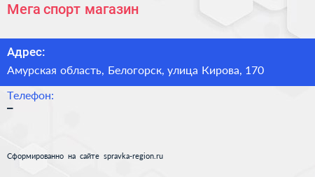 Мега спорт, магазин по адресу Амурская область, Белогорск, улица Кирова, 170 в дальнейшем Организация, размещена в следующих категориях: