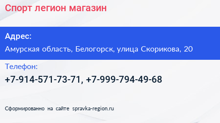 Спорт легион, магазин по адресу Амурская область, Белогорск, улица Скорикова, 20 в дальнейшем Организация, размещена в следующих категориях: