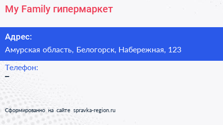 My Family, гипермаркет по адресу Амурская область, Белогорск, Набережная, 123 в дальнейшем Организация, размещена в следующих категориях: