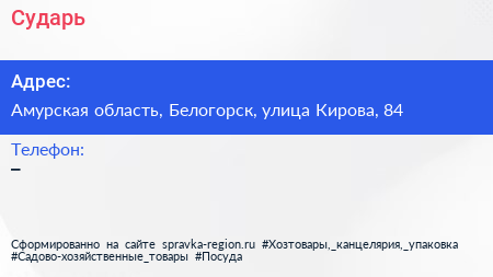 Сударь по адресу Амурская область, Белогорск, улица Кирова, 84 в дальнейшем Организация, размещена в следующих категориях: