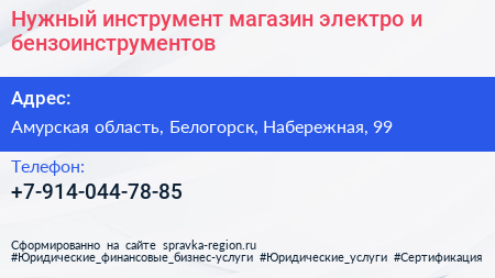 Нужный инструмент, магазин электро и бензоинструментов по адресу Амурская область, Белогорск, Набережная, 99 в дальнейшем Организация, размещена в следующих категориях: