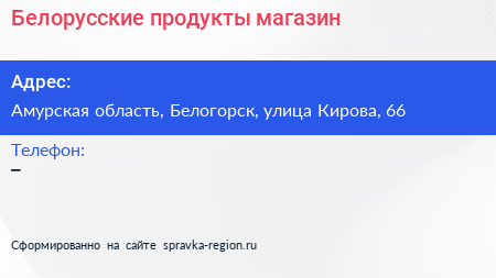 Белорусские продукты, магазин по адресу Амурская область, Белогорск, улица Кирова, 66 в дальнейшем Организация, размещена в следующих категориях: