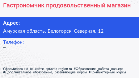 Гастрономчик, продовольственный магазин по адресу Амурская область, Белогорск, Северная, 12 в дальнейшем Организация, размещена в следующих категориях: