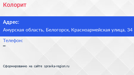 Колорит по адресу Амурская область, Белогорск, Красноармейская улица, 34 в дальнейшем Организация, размещена в следующих категориях: