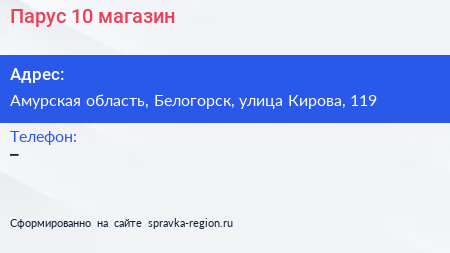 Парус-10, магазин по адресу Амурская область, Белогорск, улица Кирова, 119 в дальнейшем Организация, размещена в следующих категориях: