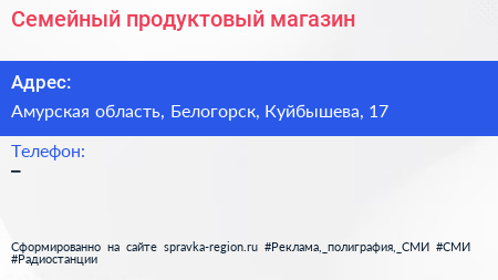 Семейный, продуктовый магазин по адресу Амурская область, Белогорск, Куйбышева, 17 в дальнейшем Организация, размещена в следующих категориях: