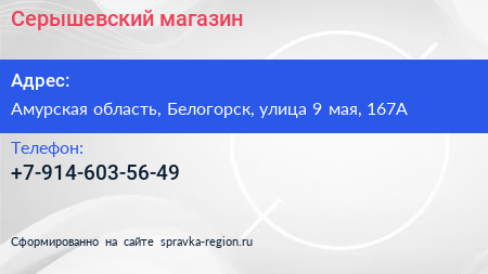 Серышевский, магазин по адресу Амурская область, Белогорск, улица 9 мая, 167А в дальнейшем Организация, размещена в следующих категориях: