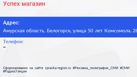 Успех, магазин по адресу Амурская область, Белогорск, улица 50 лет Комсомола, 28 в дальнейшем Организация, размещена в следующих категориях: