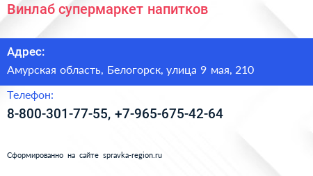 Винлаб, супермаркет напитков по адресу Амурская область, Белогорск, улица 9 мая, 210 в дальнейшем Организация, размещена в следующих категориях: