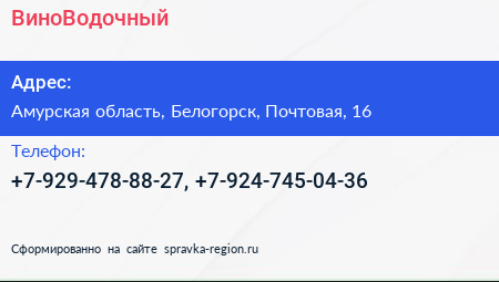 ВиноВодочный по адресу Амурская область, Белогорск, Почтовая, 16 в дальнейшем Организация, размещена в следующих категориях: