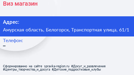Виз, магазин по адресу Амурская область, Белогорск, Транспортная улица, 61/1 в дальнейшем Организация, размещена в следующих категориях: