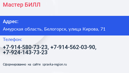 Мастер БИЛЛ по адресу Амурская область, Белогорск, улица Кирова, 71 в дальнейшем Организация, размещена в следующих категориях:
